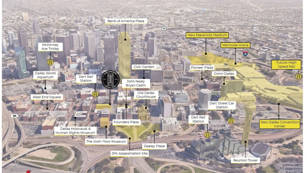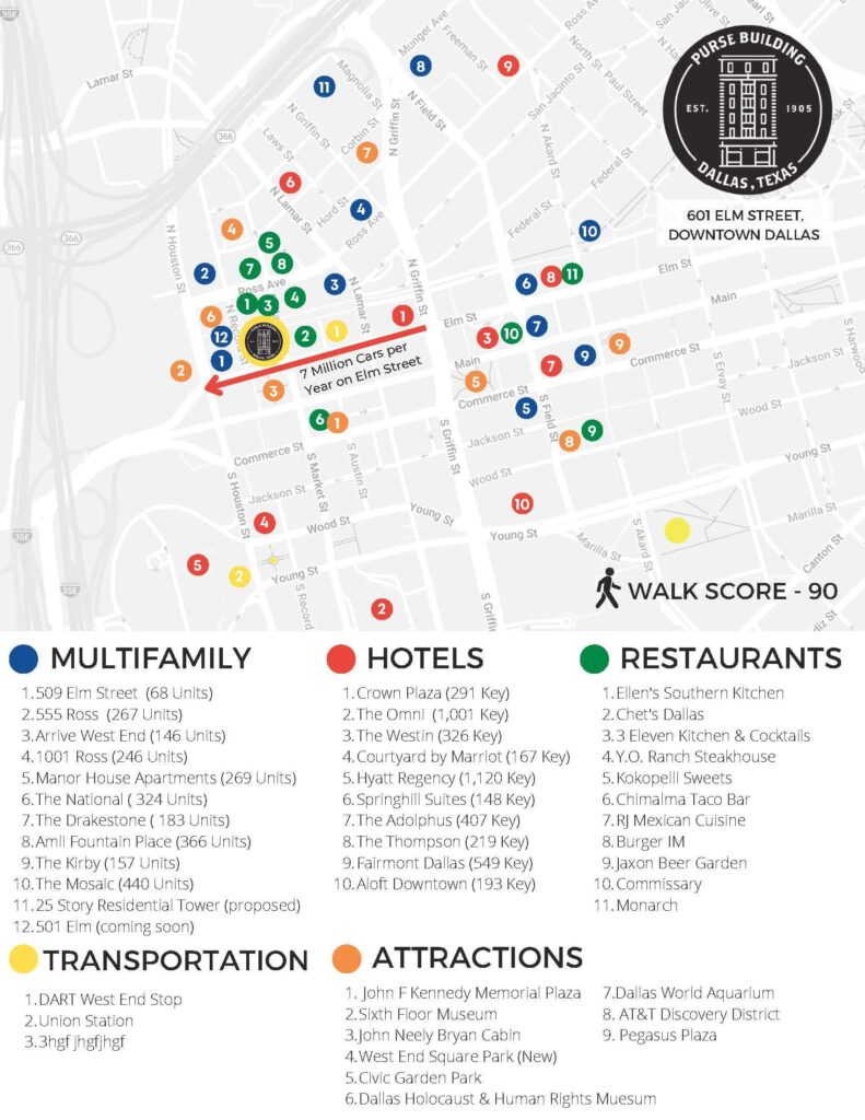 A map of the district shows how the Purse Building sits at the center of the West End’s connections to Dealey Plaza, the government district, and the surrounding amenities.